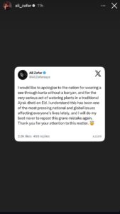 In response, Ali Zafar shared a story on Instagram, adopting a polite yet sarcastic tone. He “apologized” and expressed regret for wearing a light kurta without an undershirt and for having the “audacity” to wear traditional attire on the occasion of Eid.