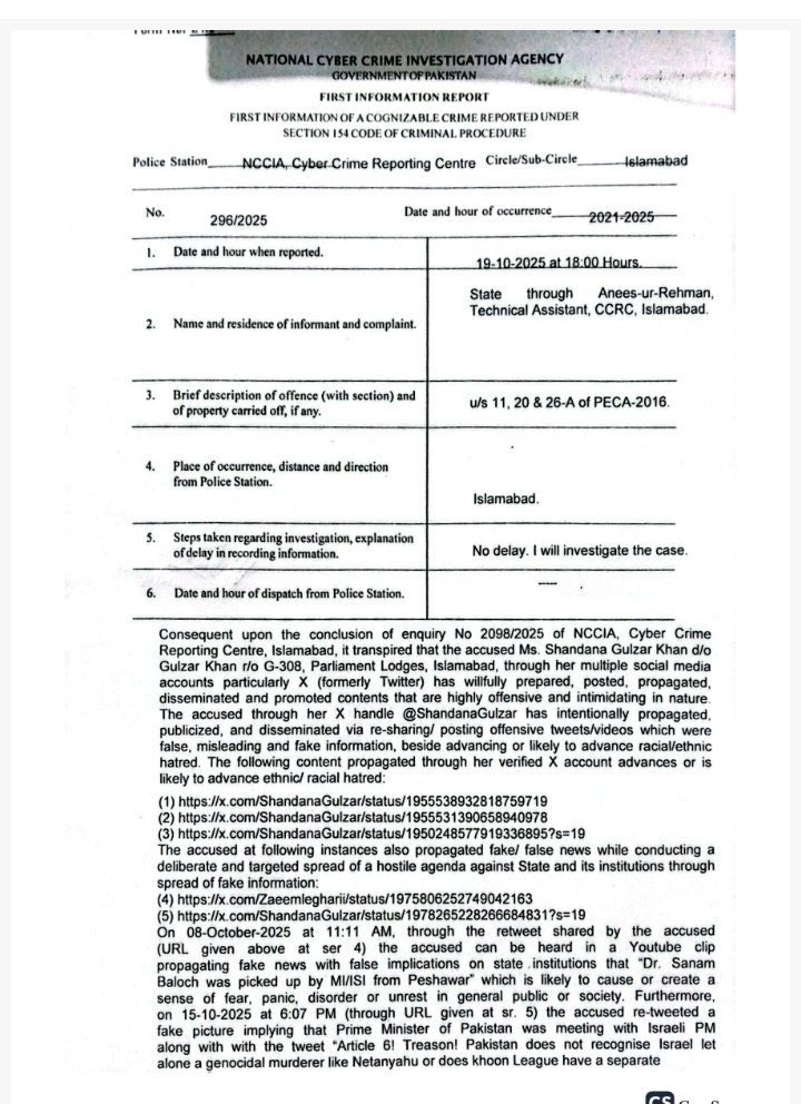 ISLAMABAD: The National Cyber Crime Investigation Agency (NCCIA) has registered a First Information Report (FIR) against Pakistan Tehreek-e-Insaf (PTI) leader Ms. Shandana Gulzar Khan for allegedly spreading fake news, promoting ethnic hatred, and running a targeted campaign against state institutions through her social media accounts.